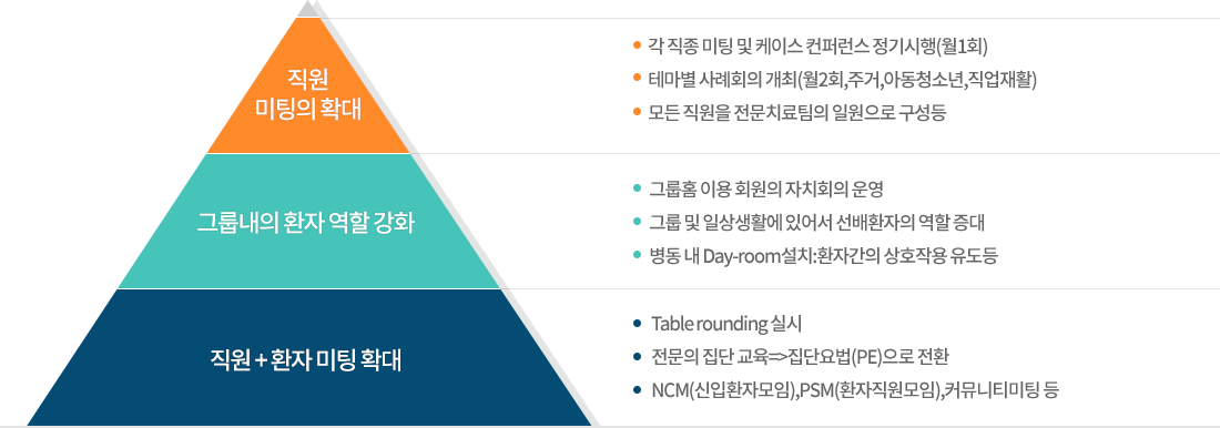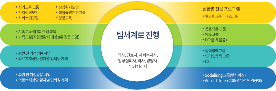 팀 체계로 진행(의사, 간호사, 사회복지사, 임상심리사, 작업치료사, 약사, 영양사, 임상병리사)
