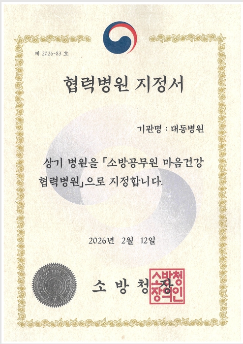 본원이 소방청으로부터 「소방공무원 마음건강 협력병원」 으로 공식 지정되었습니다.